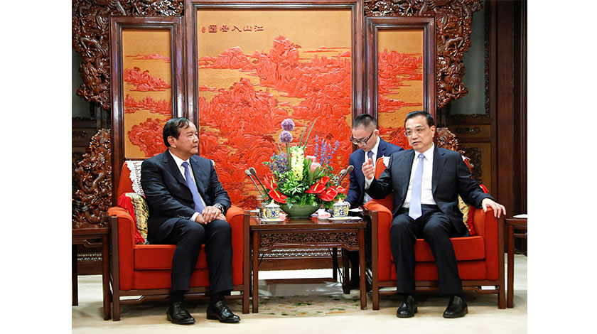 5月31日下午,中國國務院總理李克強在北京中南海紫光閣會見柬埔寨副首相兼外交大臣布拉索昆。(中新社圖片/劉震 攝)