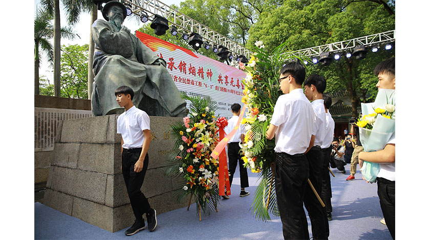 6月3日,學生代表向林則徐塑像敬獻花籃。當日,『傳承銷煙精神•共享無毒生活』廣東省全民禁毒工程『6•3』虎門銷煙180周年紀念日活動在廣東東莞虎門舉行,並在銷煙池畔舉行了銷毀毒品儀式。(中新社圖片/ 宋理光 攝)