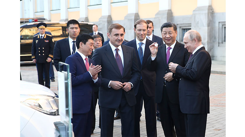 當地時間6月5日,中國國家主席習近平在莫斯科同俄羅斯總統普京參觀長城汽車圖拉州工廠下線汽車展。(中新社圖片/ 毛建軍 攝)