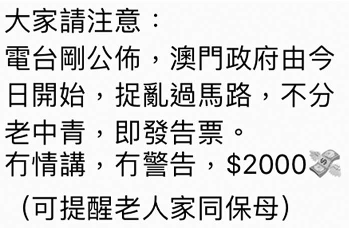 【特訊】近日網上流傳政府將對亂過馬路的居民罰款2000元澳門幣的消息,經查證後,發現此信息為謠言。果六坊會理事長徐鳴莉關注事件,希望政府有關部門能及時澄清謠言,遏止謠言傳播,以免不實信息瘋傳危害社會穩定。