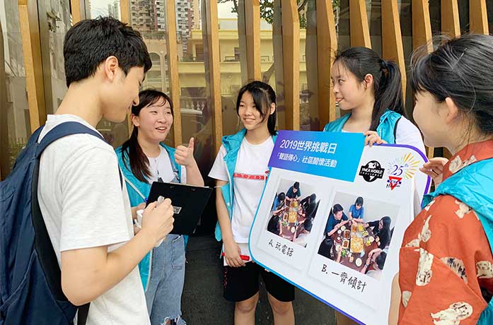 【特訊】「世界挑戰」(YMCA World Challenge)是世界基督教青年會協會發起的全球性青年挑戰活動,由全球120個國家及地區的青年會組成的世界協會,自二○一三年起,每年均會在六月舉行全球活動「世界挑戰日」,以不同主題號召全球各地青年會一同參與,為青年們發聲,澳門基督教青年會作為世界協會的一員,一直支持此項甚具義意的活動。適逢今年是基督教青年會成立175周年,亦是澳門基督教青年會成立25周年,為此主辦單位於6月8日舉行了「聲語傳心」社區關懷活動,令大眾關注「同枱食飯,各玩手機」的社會現象,組織了超過100名義工在本澳社區進行了175分鐘推廣活動,呼籲市民大眾放下手機,珍惜用餐好時機,與身邊的人多溝通互動,增進彼此感情。