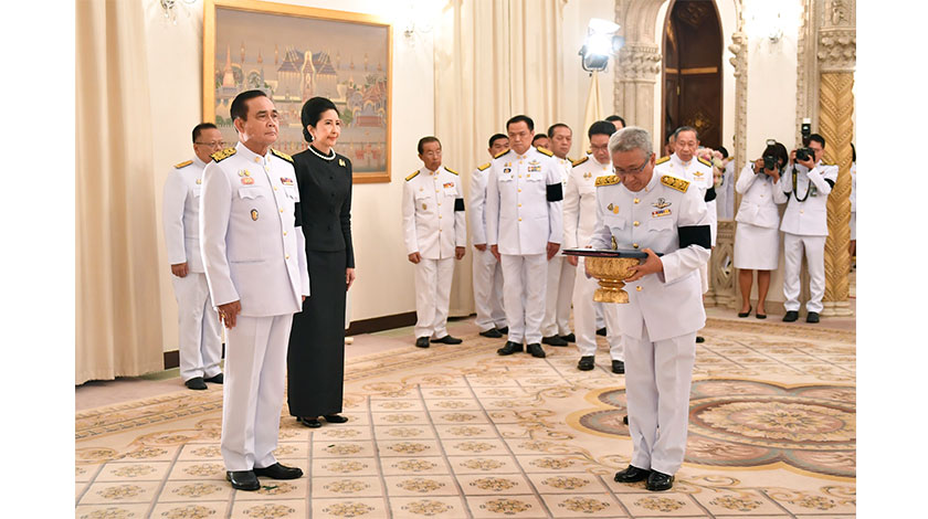 6月11日,在泰國曼谷,相關工作人員來到總理府對泰國總理巴育(前左)宣讀國王聖諭。泰國國王瑪哈•哇集拉隆功11日批准巴育出任泰國新一任總理。當天中午,工作人員赴總理府向巴育宣讀了國王聖諭。聖諭說,巴育在5日國會會議上獲得半數以上議員的支持,當選總理。國王按照憲法程序批准巴育出任泰國總理,立即生效。(新華社發)