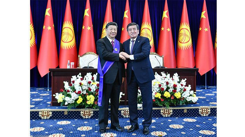 6月13日,國家主席習近平在比什凱克出席儀式,接受吉爾吉斯斯坦總統熱恩別科夫授予「瑪納斯」一級勳章。(新華社記者 謝環馳 攝)