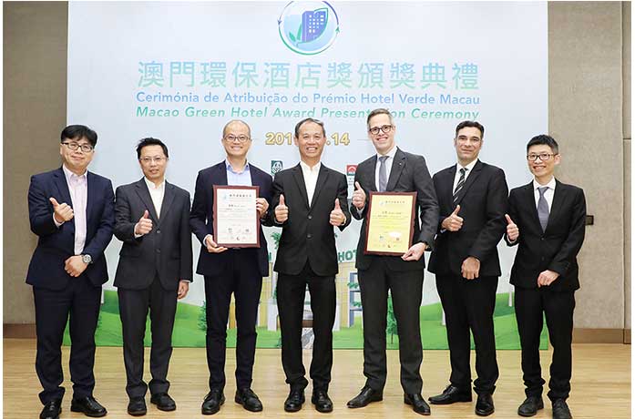 【特訊】銀河娛樂集團(下稱「銀娛」)積極配合澳門特區政府實現「構建低碳澳門共創綠色生活」,在旗下多個物業推動多元節能減排措施,減低營運對環境的影響,「澳門銀河」的澳門大倉酒店及「澳門百老匯」的百老匯酒店更分別於「2018澳門環保酒店獎」獲得金奬及銀奬,成效得到肯定。14日,由環境保護局主辦、旅遊局協辦的「2018澳門環保酒店獎」頒奬典禮假電力公司大樓舉行,澳門大倉酒店總經理馬志力及「澳門百老匯」工程事務及設備助理副總裁葉建生代表領奬。除了落實環保措施,銀娛亦致力組織可持續發展推廣活動,冀善用自身資源,協助特區政府帶動本澳社區的綠色氛圍。