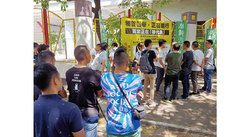 【本報訊】下屆行政長官將由四百名委員 (簡稱選委) 選出,其中三百四十四名選委在昨日由五千七百多人投票產生。新澳門學社在其中一個票站外集會,凸顯選委選舉的不公平、不合理。