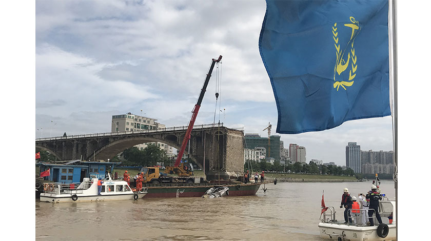 6月17日,廣東河源東江大橋垮塌現場搜救取得重大進展。據河源海事局消息,海事部門協調廣州打撈局、南海救助局等部門以及藍天志願者等隊伍,奮戰近80個小時,先後經過14次蛙人下水作業,于17日9時7分,將第二輛落水汽車順利打撈出水,未發現失聯人員。東江大橋于14日淩晨2時12分許突然坍塌,兩輛小車落水。落水車輛上共有3人,其中1人自救上岸,被附近市民成功救起並送往醫院治療。(中新社圖片/陳德峰 攝)