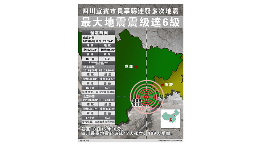 截至6月18日8時20分,長寧地震已造成13人死亡,受傷199人。但中午時分,藍天救援隊又成功搜救出雙河鎮雙河社區一名男子的遺體,這是藍天救援隊在長寧縣災區搜救出的第一名遇難者遺體。目前,地震死亡人數已增至13人。
