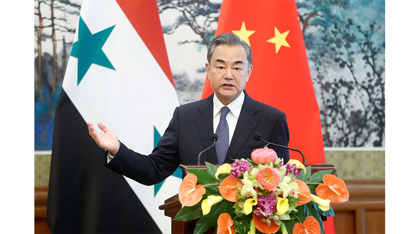 6月18日,中國國務委員兼外長王毅在北京同叙利亞副總理兼外長穆阿利姆共見記者時,應詢就當前伊朗核問題和海灣地區局勢發表看法。(中新社圖片/韓海丹 攝)