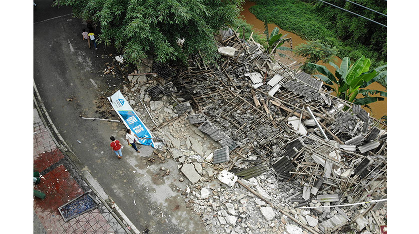 6月18日,航拍四川省宜賓市長寧縣雙河鎮,一處坍塌的民房。6月17日22時55分,四川宜賓長寧縣雙河鎮發生6.0級地震,震源深度16公里。(中新社圖片/張浪 攝)