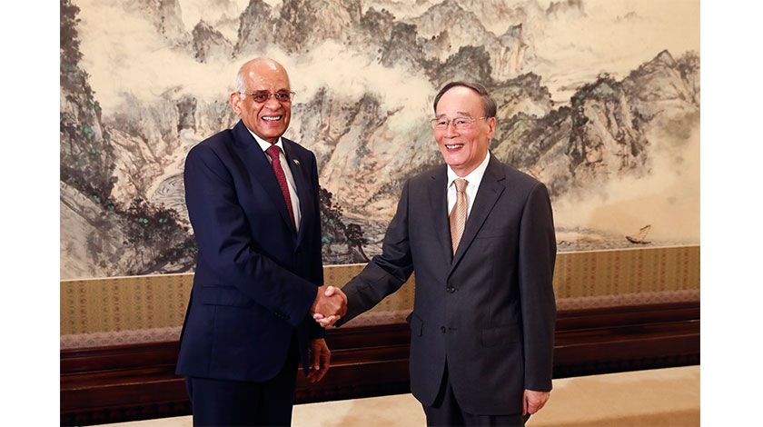 6月19日,中國國家副主席王岐山在北京中南海紫光閣會見埃及議長阿里。(中新社圖片/ 盛佳鵬 攝)