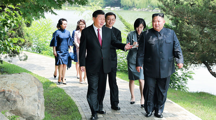 6月21日,中共中央總書記、國家主席習近平在錦繡山迎賓館會見朝鮮勞動黨委員長、國務委員會委員長金正恩。習近平夫人彭麗媛及金正恩夫人李雪主參加會見。會見前,習近平夫婦和金正恩夫婦在庭院內散步交談。 (新華社記者 龐興雷 攝)
