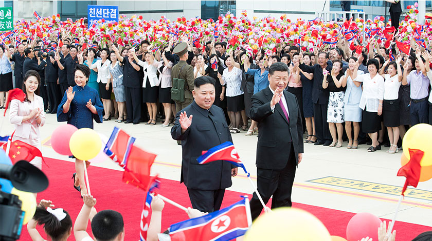 6月21日,中共中央總書記、國家主席習近平結束對朝鮮的國事訪問離開平壤回國。離開前,習近平和夫人彭麗媛出席朝鮮勞動黨委員長、國務委員會委員長金正恩和夫人李雪主在機場舉行的歡送儀式。(新華社記者 黃敬文 攝)