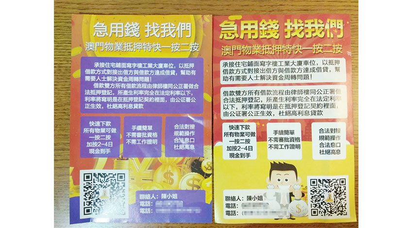 【特訊】近日有街坊反映,自己居住的大廈收到某份物業抵押私人借貸廣告宣傳單,這些宣傳單大都只留下私人聯絡電話,沒有公司名稱、地址及經營准照,懷疑為非法借貸。草六坊會理事長盧定淦呼籲街坊切勿輕信宣傳單信息,同時冀當局加強打擊非法借貸活動,防止因非法借貸衍生各種社區問題。