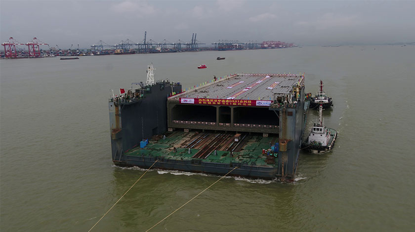 6月26日,深(圳)中(山)通道工程首節沉管隧道鋼殼完成製造,出運至珠海進行自密實混凝土澆築及舾裝,計劃今年底實現首節沉管安放。(中新社圖片/ 岳路建 攝)