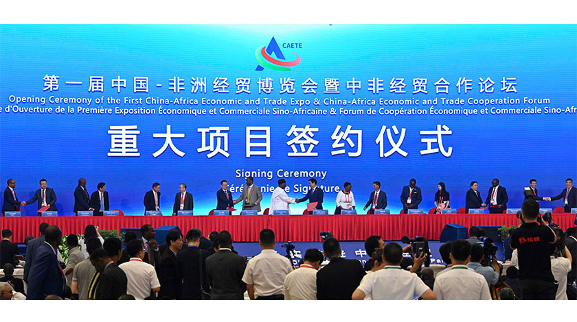 6月27日,第一屆中國-非洲經貿博覽會開幕式暨中非經貿合作論壇在湖南省長沙市舉行,一批中非重大項目在開幕式結束後進行簽約。(中新社圖片/ 侯宇 攝)