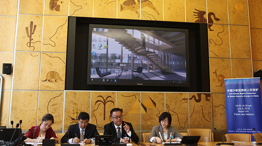 當地時間7月2日,在聯合國人權理事會第41屆會議期間,中國人權研究會一行在聯合國日內瓦總部萬國宮舉辦『中國少數民族人權保護』邊會,詳細介紹了藏傳佛教活佛轉世制度和新疆社會治理與人權保障情況,人權研究會理事更結合親身經歷,列舉了極端主義影響、侵犯乃至踐踏民眾生產生活的事例。(中新社圖片/ 德永健 攝)