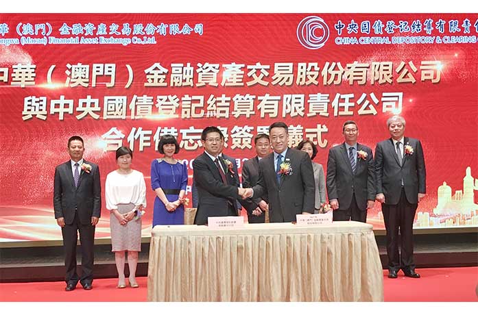 【本報訊】中華(澳門)金融資產交易股份有限公司(MOX)昨與中央國債登記結算有限責任公司(中債登)簽署合作備忘錄,將澳門債券市場基礎設施與內地債券市場基礎設施結合,標誌著境內外債券市場在發行及登記託管等方面的互通互聯,填補了澳門直接融資管道的空白,促進澳門債券市場的發展。