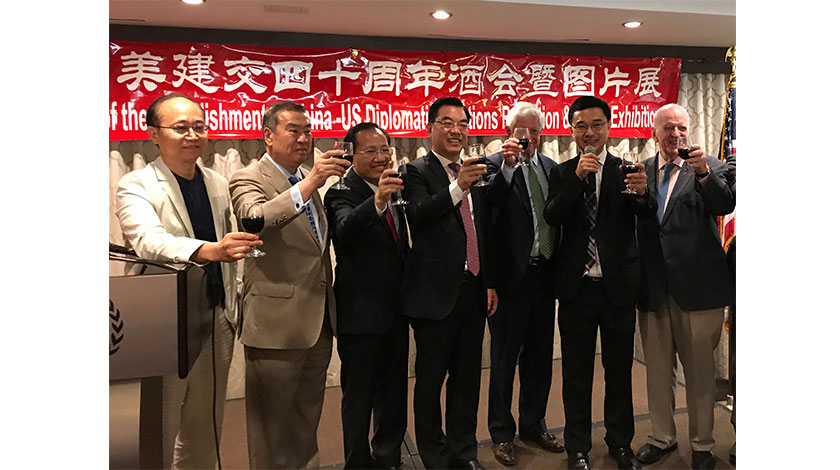 7月6日,由紐約中國和平統一促進會主辦的中美建交四十周年酒會暨圖片展在美國紐約舉行。此次圖片展由中國新聞社提供支持,選取中美建交40年來的代表性瞬間,展示兩國各領域交流合作成果。圖為中國駐紐約總領事黃屏(中)同與會嘉賓合影。(中新社圖片/ 馬德林 攝)