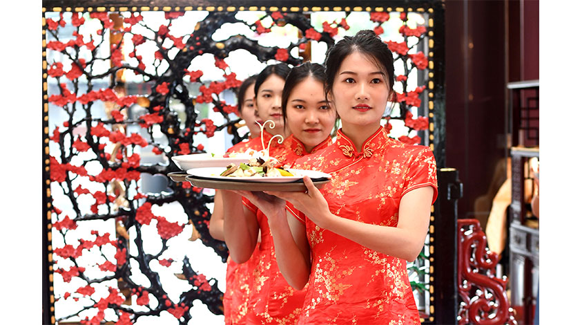 7月8日上午,正逢農曆六月初六,第九屆『荔枝灣•新西關』民俗文化節——『六月六•紅雲秀』系列活動在廣州市荔灣區舉行。現場不僅有品嚐廣州西關精品點心、觀看嶺南畫派畫師現場描畫荔枝等環節,還再現了中國歷史上五代十國時期南漢後主劉鋹在荔枝灣大擺『紅雲宴』的場景。圖為四名旗袍女子托舉菜品出場。