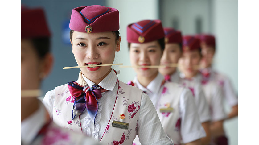 近日,為進一步提昇動車組服務水平,做好微笑服務,重慶客運段動車4隊組織休班列車長、列車員進行為期一周的禮儀培訓,對儀容儀態和服務技巧等方面進行強化訓練,旨在提昇整體精神面貌,應對中國鐵路即將迎來『7.10』調圖。圖為7月5日,列車員咬筷子練微笑。 (中新社圖片/蘇志剛 攝)