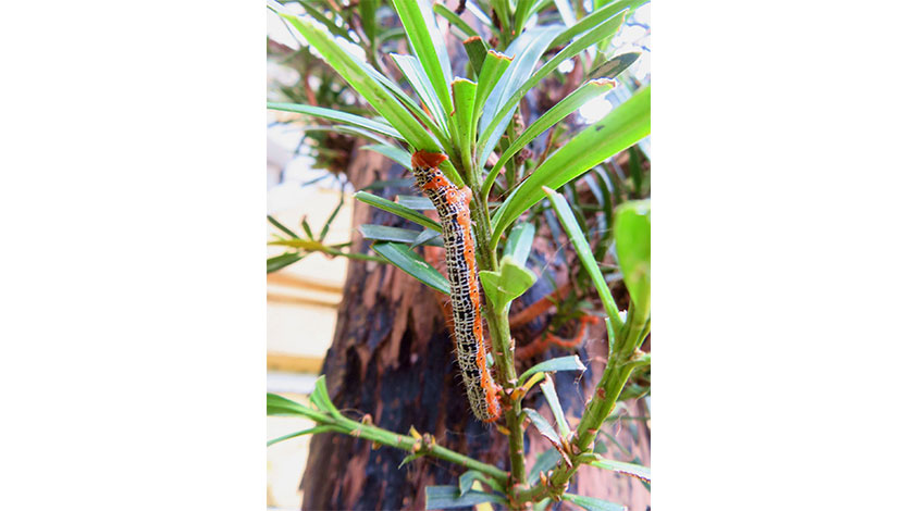 該蛾幼蟲以食用羅漢松及竹柏葉片為主,其成蟲艷麗,一年內可繁殖多代,幼蟲數量多且食量大,能把樹葉啃食殆盡,嚴重威脅植物健康,部分幼蟲會吐絲懸吊在枝椏上並產生大量蟲糞,對環境衛生構成影響。