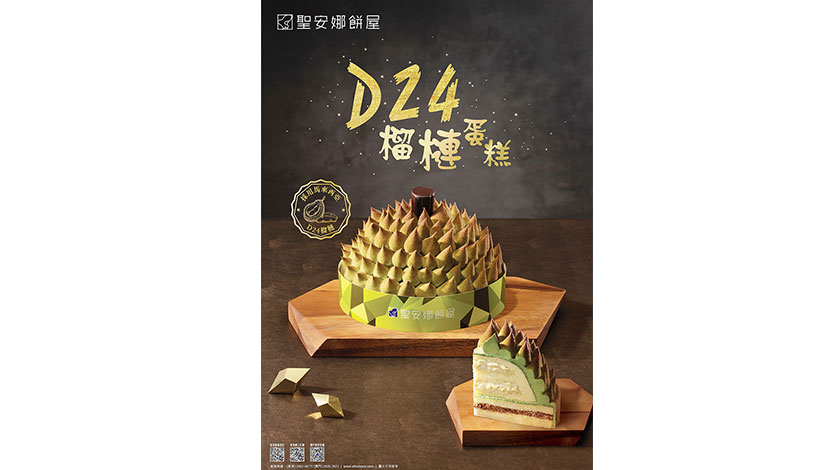 【特訊】又到榴槤當造的季節,聖安娜餅屋將頂級的D24榴槤由馬來西亞空運來港,推出以3D榴槤造型登場的「D24榴槤蛋糕」。蛋糕內裡的榴槤忌廉夾心由D24榴槤肉及細滑鮮忌廉打成,綿密口感中帶絲絲榴槤果肉,香味濃郁撲鼻,入口回甘。經驗豐富的聖安娜蛋糕師傅將細密的忌廉鋪蓋蛋糕面層,使榴槤香味不易外洩。由7月4日起,「D24榴槤蛋糕」於聖安娜餅屋分店接受提前預訂,季節限量供應,榴槤迷萬勿錯過。