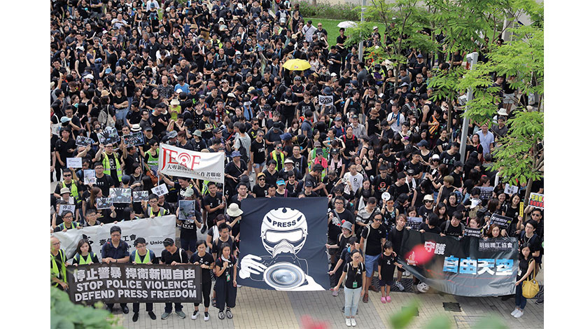 【本報訊】香港七個傳媒工會昨早發起靜默遊行,抗議警方在近期示威活動期間,多次妨礙傳媒採訪以及粗暴對待前線記者。遊行隊伍先到警察總部外遞交請願信,再然後到特首辦外讀出宣言 (http://bit.ly/2Oa0jeb)。香港記者協會也宣布透過眾籌成立「保護記者基金」,資助新聞工作者對施行暴力的人士,採取法律行動。