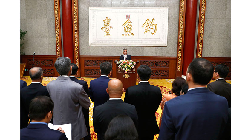 7月18日,中國國務委員兼外交部長王毅在北京出席外交部為亞洲國家駐華使節舉辦的招待會,併發表即席講話。(中新社圖片/ 富田 攝)