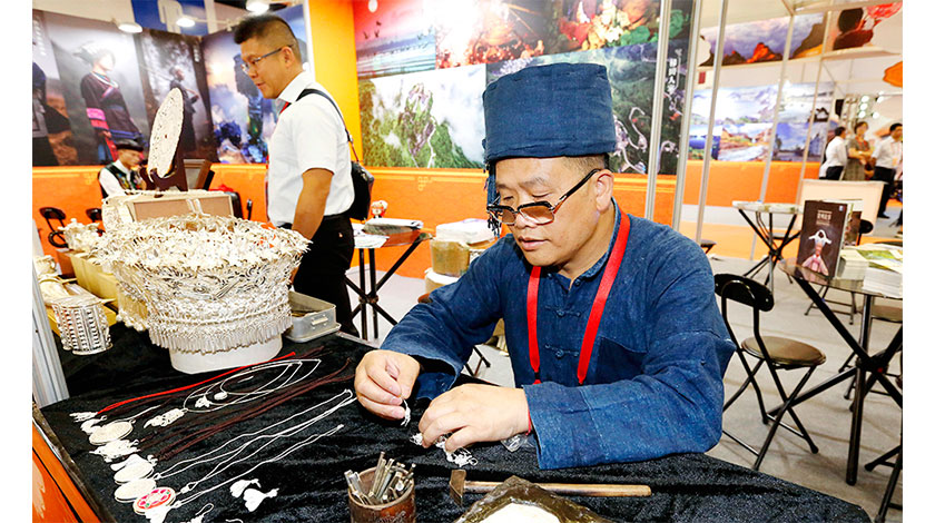 7月19日,2019海峽兩岸台北夏季旅展在台北世貿中心登場。大陸21個省區市聯袂來台,以“美麗中華”為主題共同參展。圖為貴州非遺傳承人現場展示傳統銀飾工藝,文旅融合趨勢也讓展會現場更加豐富多彩。(中新社)