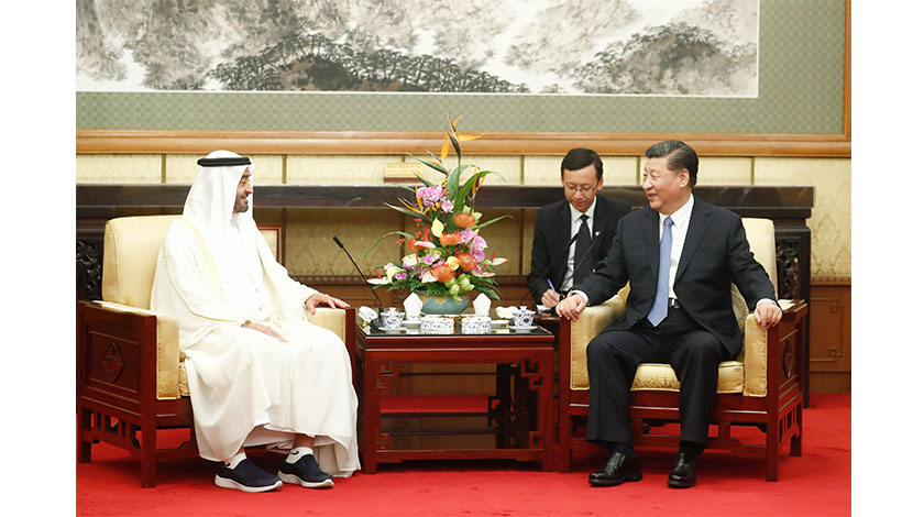 7月22日晚,中國國家主席習近平在北京釣魚台國賓館再次會見來華進行國事訪問的阿聯酋阿布扎比王儲穆罕默德。(中新社圖片/盛佳鵬 攝)