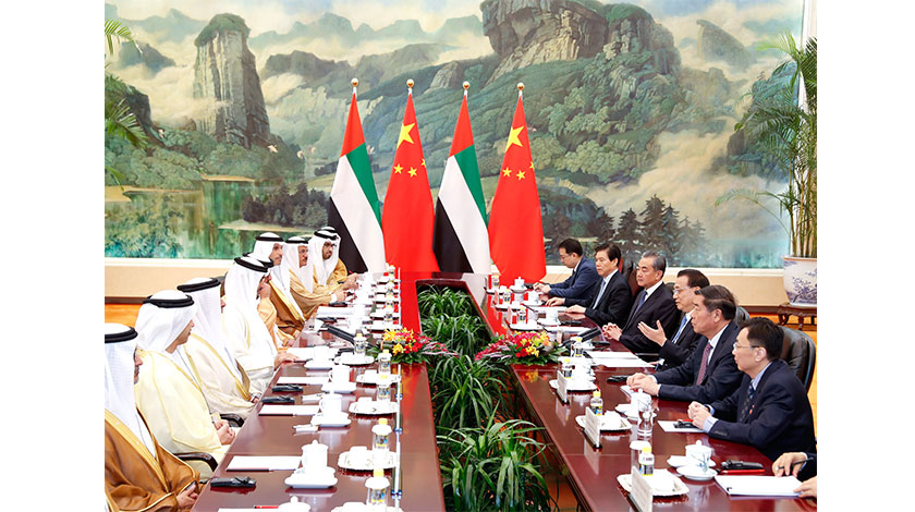 7月22日,中國國務院總理李克強在北京人民大會堂會見來華進行國事訪問的阿聯酋阿布扎比王儲穆罕默德。(中新社圖片/劉震 攝)