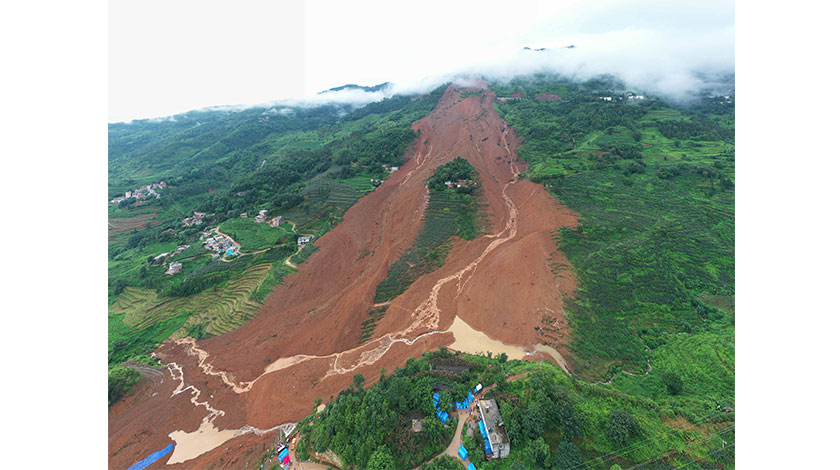 7月24日,航拍水城縣雞場鎮坪地村岔溝組滑坡現場。7月23日21時20分,貴州省六盤水市水城縣雞場鎮坪地村岔溝組發生一起山體滑坡事件,21幢房屋被埋。接報後,貴州省各部門立即啟動應急響應,緊急組織應急、公安、消防、自然資源、衛生健康、交通等救援隊伍,連夜趕往現場開展搶險救援。截至7月24日0時30分,已搶救出10人。目前,搶險救援和失聯人數核查正在緊張進行中。 (中新社圖片/賀俊怡 攝)