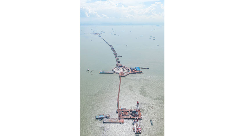 7月24日,歷經近10小時施工,深中通道伶仃洋大橋東索塔鋼吊箱下放完成,將轉入水上施工階段。圖為圖從下至上依次為深中通道伶仃洋大橋東主塔施工平台、東錨碇施工平台、棧橋,遠方為西人工島。(中新社圖片/岳路建 攝)