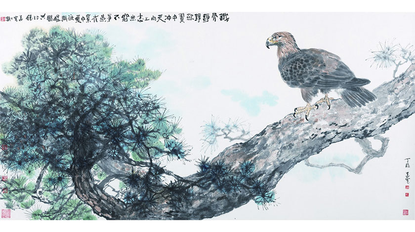 劉孟寬畫風清新脫俗,擅長繪畫花卉、動物、禽鳥、魚蟲、山水等,作品富嶺南畫派寫生精神,融合嶺南畫派及西方技法。是次展出的作品盡顯其紮實的繪畫功底,展品《鷹揚萬里》以細膩線條勾勒松枝、鷹隼,羽毛部分層層渲染,深得業師楊善深啟發;另一作品《赤壁懷古》用宋代文學家蘇軾詞意入畫,以一人撫琴,江海東流之景,構建動靜結合的視覺觀感,表現其對「大江東去」的理解及浩然精神的追尋。