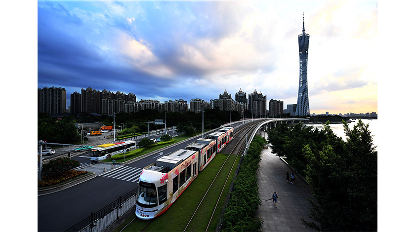 7月25日,一輛『不忘初心、牢記使命』主題有軌電車亮相廣州新中軸線。圖為行駛中的主題列車。 (中新社圖片/ 姬東 攝)