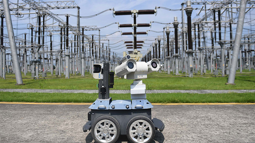 月26日,一台機器人在變電所巡檢電力設施。當日,浙江省電力部門工作人員在高溫下利用機器人、無人機等巡檢電力設施,保障夏季電力供應。 (中新社圖片/王剛 攝)