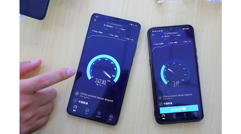 7月27日,山西省太原市,工作人員正在進行5G手機與4G手機測速對比。7月26日,華為公司在深圳發佈首款可商用的5G雙模手機Mate20X(5G)。據悉,這款手機在中國獲得了第一張5G手機入網許可證,將於8月16日上市。 (中新社圖片/張雲 攝)