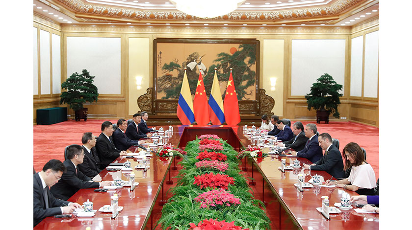 習近平指出,拉美和加勒比國家擁有巨大發展潛力和廣闊前景,是國際格局中不可忽視的重要力量。中方一貫尊重拉美人民自主選擇發展道路的權利,支持拉美加快一體化進程,通過對話協商妥善處理委內瑞拉等地區問題,維護地區和平穩定。中方願繼續發揮勸和促談作用,願同哥方保持溝通。中拉合作本質上屬於南南合作範疇,完全基於相互尊重、平等互利、合作共贏、開放包容的原則。中方願同拉方推進中拉論壇機制建設,共建中拉命運共同體。