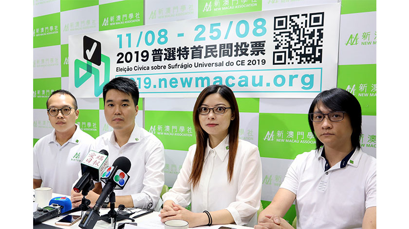 【本報訊】新澳門學社將於八月十一至二十五日舉辦「普選特首民間投票」活動,市民可透過電子投票 (https://2019.newmacau.org),對有關普選的單一命題表態。學社提醒,政府應以虛心和正面態度,看待市民透過「民間投票」此一合法方式表達意見,尤應尊重市民對民主政制的追求,作為持續推進政治民主化的最大動力。