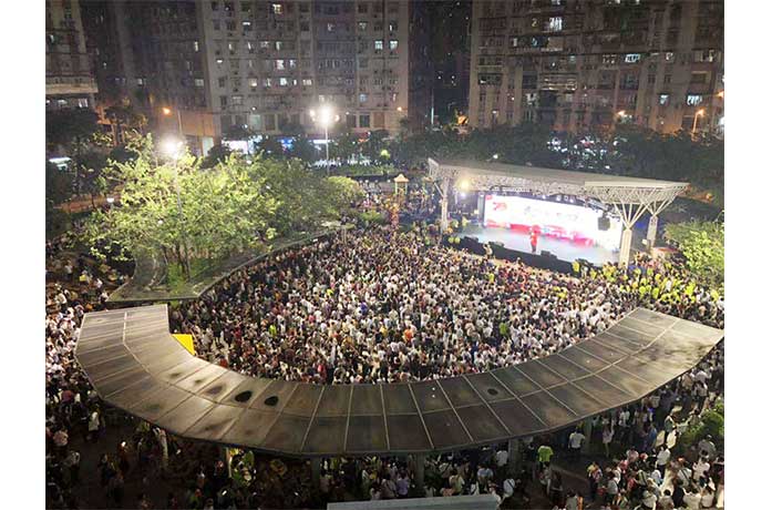【特訊】為慶祝中華人民共和國成立七十周年暨澳門回歸二十周年,民眾建澳聯盟昨晚在祐漢公園舉辦“民眾齊歡․共享榮光,迎‘雙慶’入社區、惠基層”文藝聯歡晚會,中聯辦副主任張榮順、協調部部長傅鐵生,行政會發言人梁慶庭,法務局局長劉德學,消費者委員會執行委員會主席黃翰寧,消防局副局長鄒家昌,海事及水務局副局長郭虔,民建聯創會主席陳明金、榮譽主席施家倫、理事長李良汪等出席,與市民共賀“雙慶”,晚會節目精彩,現場氣氛熱烈。活動最高峰在場人士超過三千人,入場人次超過五千人。