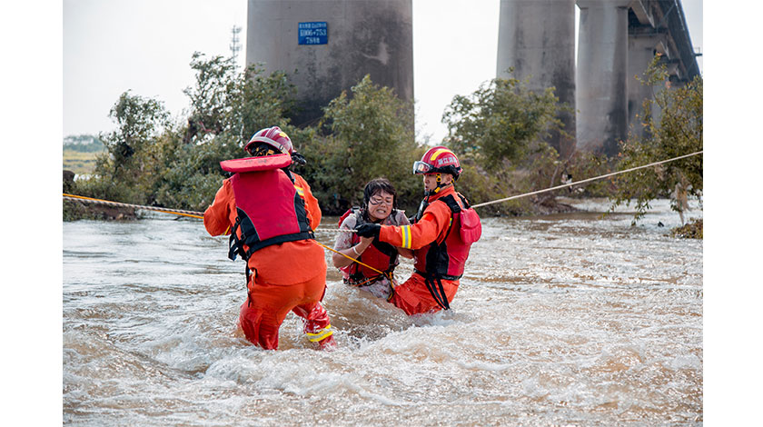 8月11日,兩名消防隊員營救一名受困市民。受今年第9號台風『利奇馬』影響,浙江台州、衢州、寧波等地出現受澇嚴重、河水暴漲、缺水等問題,各地救援力量紛紛集結,奔赴救災第一線。(中新社圖片/崔友成 攝)