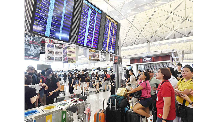 8月12日下午三時許,大批集結於香港國際機場的示威者拆走鐵馬,進入原先只限持機票旅客才可進入的離境大堂禁區前通道位置。機場方面暫時關閉禁區閘口,航班取消。(香港中通社)