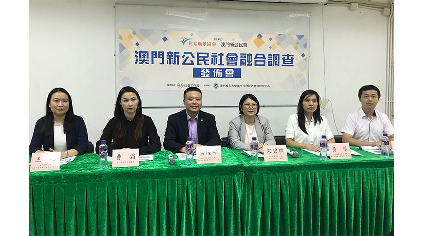 「澳門新公民社會融合調查」於今年四至八月進行,有效問卷數達七百四十份,透過投資移民及技術移民來澳人士共有一成三五,其餘均為家團方式來澳,以三十五至四十四歲佔一半,其次四十五至五十四歲年齡層,有三成一一。居住在澳門的有約九成二,居住在珠海及中山的有百分之六點八,居住在香港的僅百分之一點四。新移民人士主要從事酒店及飲食業、其次是文娛博彩及其他服務業。新來澳定居人士在澳門的社會、文化、心理、居住、社交融合度中,均處於四十至六十分中度融合水平,以文化融合度最高,有七十九點四分,心理融合度為七十六分、居住融合度為七十點六分,社交融合度為六十七點九分,社會參與融合度為五十二點三分。