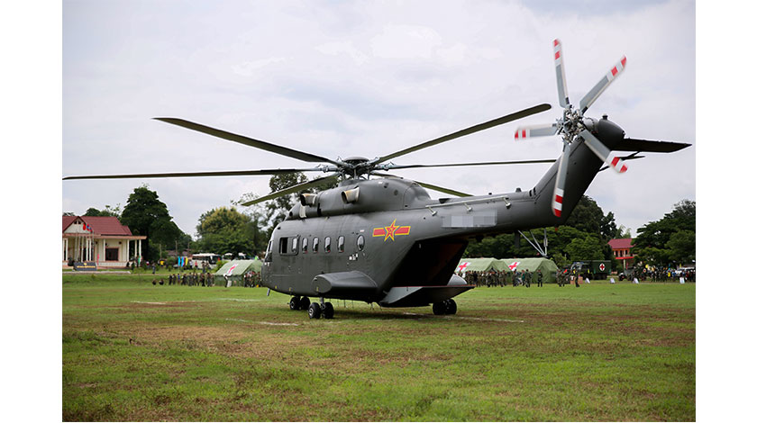 8月18日,中國陸軍直-8G新型加改裝救護直升機出現在中國—老撾軍隊「和平列車—2019」人道主義醫學救援聯合演訓活動現場,這是陸軍國產新型加改裝救護直升機首次亮相國際衛勤聯演。新華社發(熊天澤 攝)