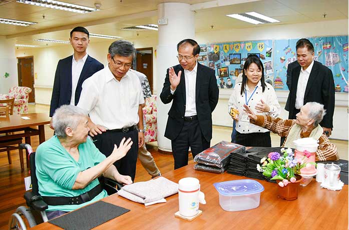 傅自應與長者近距離接觸、互動,了解他們在院舍的生活狀況,同時勉勵員工投身社會服務,為長者提供適切照顧,任重道遠,發揚敬老愛老的傳統精神。