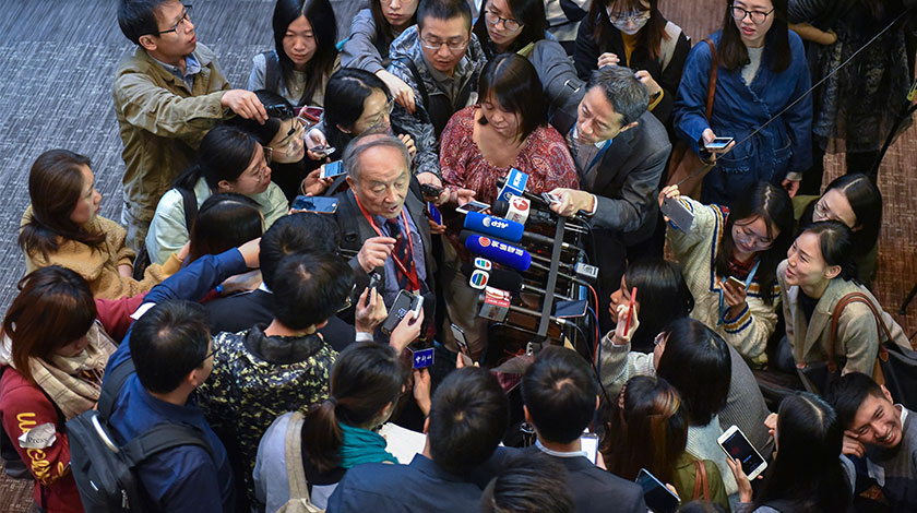 第二屆人類基因組編輯國際峰會11月27日在香港大學開幕。此前宣稱將參加峰會的南方科技大學副教授賀建奎並未出席當天的開幕會。圖為眾多媒體記者採訪生命倫理學專家邱仁宗。邱仁宗表示,衛生部門早有『對於轉基因胚胎禁止移植進入人體生殖器內』的規定,賀建奎違反規定。他說,賀建奎事件的發生是因為相關法制還不健全,他將建議國家立法規管人類基因工程。(中新社圖片/ 張煒 攝)