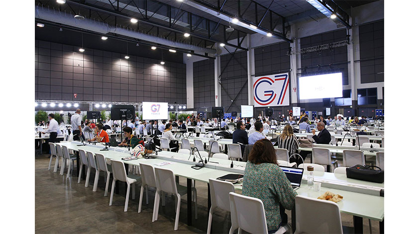 8月25日,在法國比亞里茨,記者在七國集團峰會新聞中心工作。