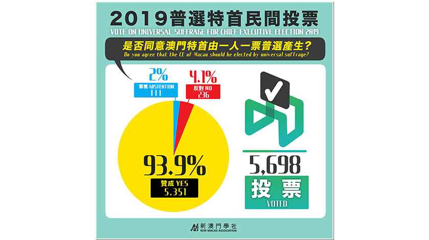 昨日,新澳門學社發出新聞稿公布「普選特首民間投票」結果:共五千六百九十八人投票,就「是否同意澳門特別行政區行政長官由普選產生」的唯一命題表態。當中,五千三百五十一票贊成 (百分之九十三點九)、二百三十六票反對 (百分之四點一)、一百一十一票棄權 (百分之二)。
