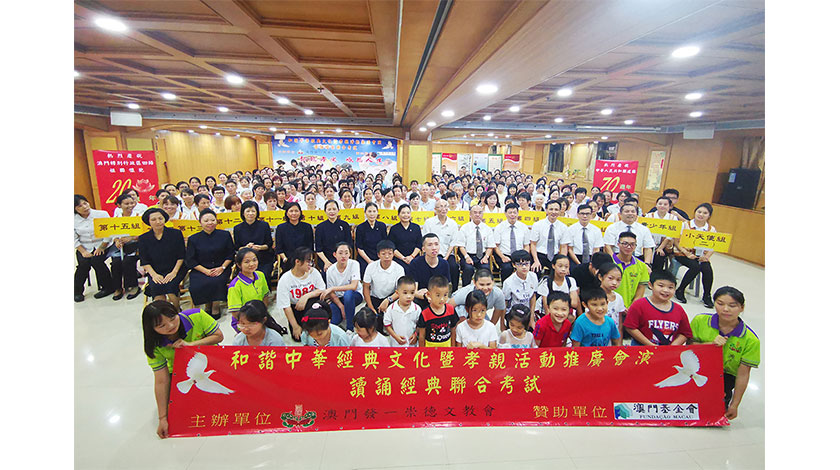 【特訊】澳門發一崇德文教會致力弘揚中華傳統文化,每年推動會員讀誦《四書五經》之章節,於日前在該會會址舉辦2019年度「讀經會考」活動,會考經典包括中庸、論語今年報考人數逾400人,年齡最大九十八歲,最小五歲,分為老中青少十九個小組考誦經典,由該會各理監事監考,並提倡祖國建國70週年,澳門回歸20週年等愛國愛澳之情懷。