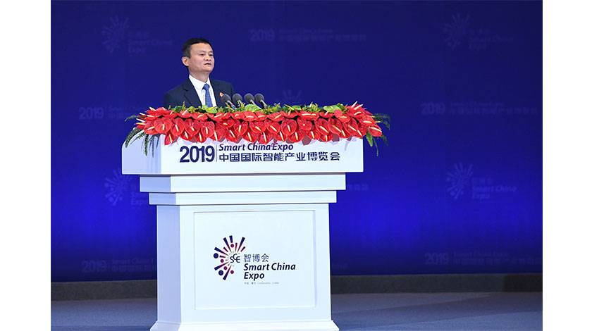 8月26日,2019中國國際智能產業博覽會(簡稱智博會)在重慶開幕。作為重頭戲之一的大數據智能化高峰會上,中外嘉賓為智博會點讚,並公佈多項與重慶的合作,聯合國數字合作高級別小組聯合主席馬雲發表主題演講。(中新社圖片/陳超 攝)